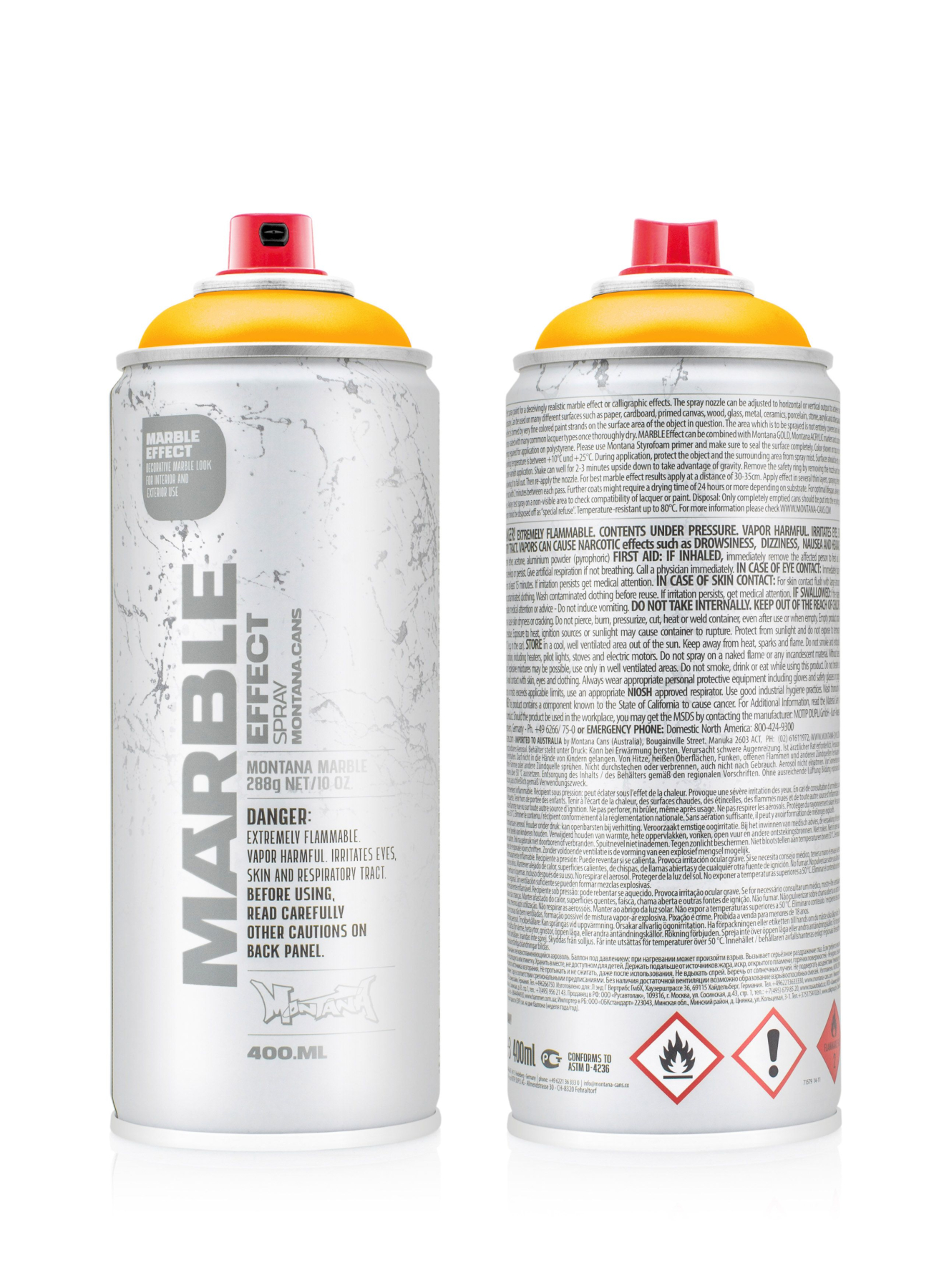 Спрей-фарба з високим рівнем покриття для оманливо реалістичного мармурового ефекту. Можна використовувати на різних поверхнях, таких як папір, картон, ґрунтоване полотно, дерево, скло, метал, кераміка, порцеляна, камінь, акрил та інші матеріали, які можна фарбувати. Ефект мармуру створюється дуже тонкими кольоровими пасмами фарби на поверхні предмета. Область, яку потрібно обприскати, не покривається повністю і залишатиметься частково видимою, тому перед використанням потрібно зробити фон бажаного кольору. Після повного висихання можна наносити багато звичайних типів лаку. MARBLE Effect можна поєднувати з маркерами Montana GOLD, Montana ACRYLIC і звичайними акриловими фарбами. Банка з мармуровим ефектом стандартно постачається з каліграфічним кепом, який можна налаштувати для створення вертикальних, горизонтальних ліній розпилення або їх варіацій.
