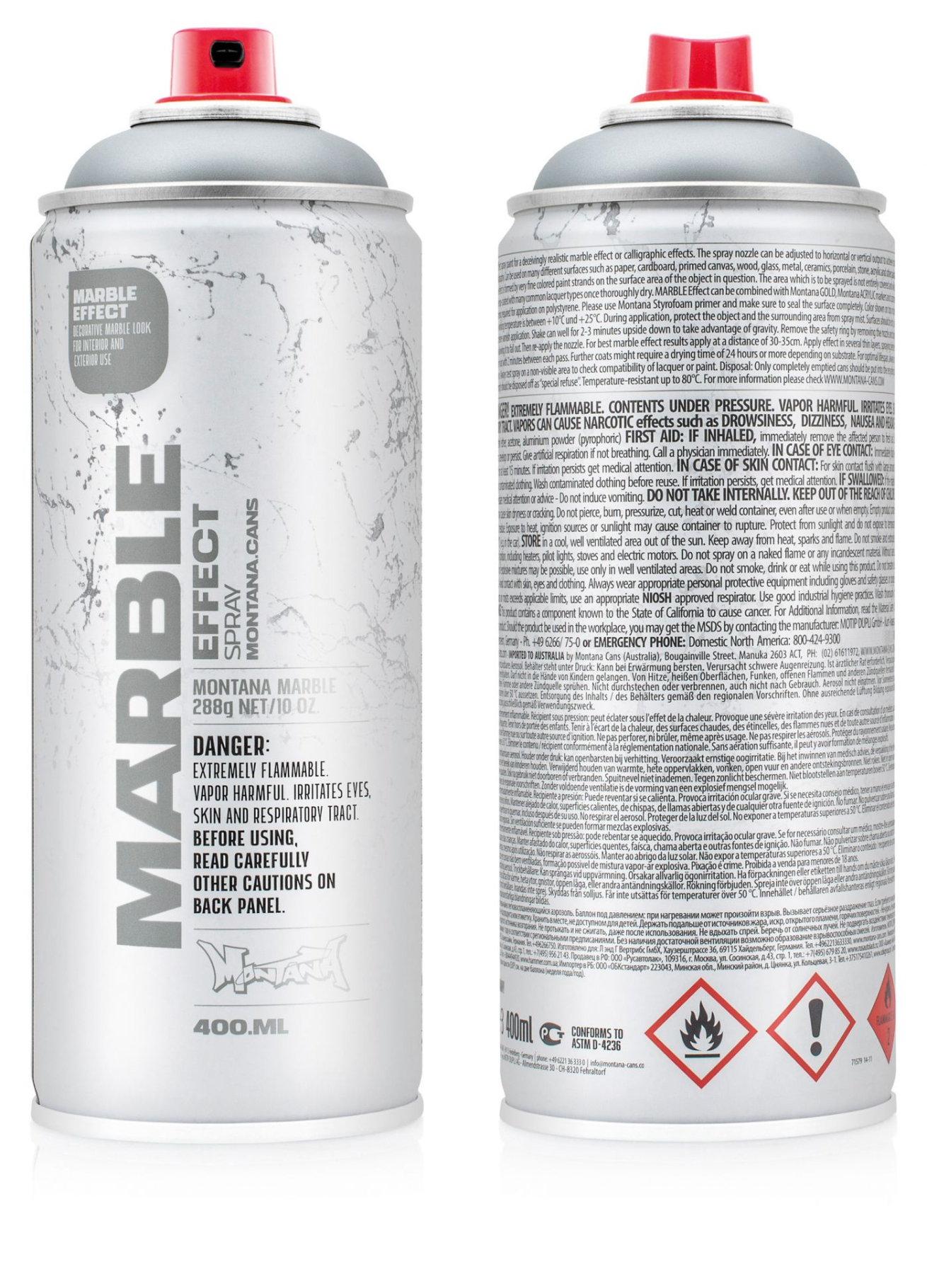 Спрей-фарба з високим рівнем покриття для оманливо реалістичного мармурового ефекту. Можна використовувати на різних поверхнях, таких як папір, картон, ґрунтоване полотно, дерево, скло, метал, кераміка, порцеляна, камінь, акрил та інші матеріали, які можна фарбувати. Ефект мармуру створюється дуже тонкими кольоровими пасмами фарби на поверхні предмета. Область, яку потрібно обприскати, не покривається повністю і залишатиметься частково видимою, тому перед використанням потрібно зробити фон бажаного кольору. Після повного висихання можна наносити багато звичайних типів лаку. MARBLE Effect можна поєднувати з маркерами Montana GOLD, Montana ACRYLIC і звичайними акриловими фарбами. Банка з мармуровим ефектом стандартно постачається з каліграфічним кепом, який можна налаштувати для створення вертикальних, горизонтальних ліній розпилення або їх варіацій.