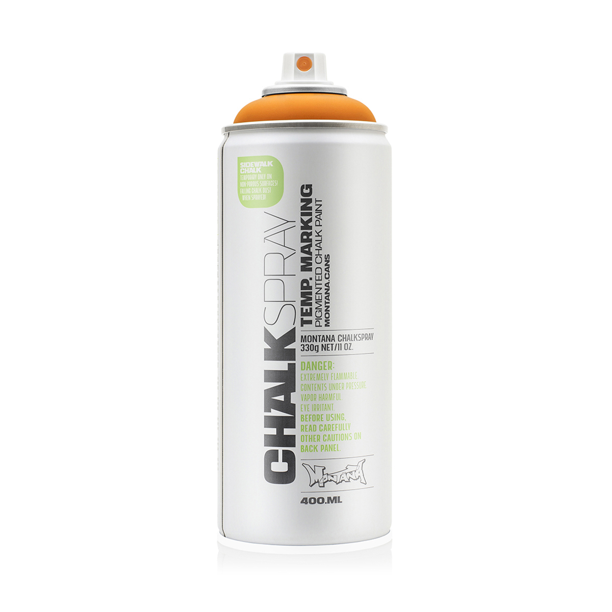 CHALKSPRAY — це пігментована крейдяна фарба, яка ідеально підходить для маркування на відкритому повітрі (лише тимчасово на непористих поверхнях). Доступний у 10 потужних кольорових відтінках, які є глибокими матовими та мають високу покривність. Montana CHALKSPRAY можна наносити на різні поверхні. Залежно від погодних умов і клімату вуличне маркування триває від кількох тижнів до кількох місяців. Малюнок зникає швидше під час тривалих періодів дощу або в місцях з інтенсивним рухом людей. На непористих поверхнях, таких як скло або метал, можна видалити пігменти. Видалення з пористих поверхонь може бути складним. При роботі на непористій поверхні рекомендується пробне нанесення та видалення на невидимій ділянці основи. Montana CHALKSPRAY вражає своїм дотиком і виглядом - типовий грубий ефект крейди.