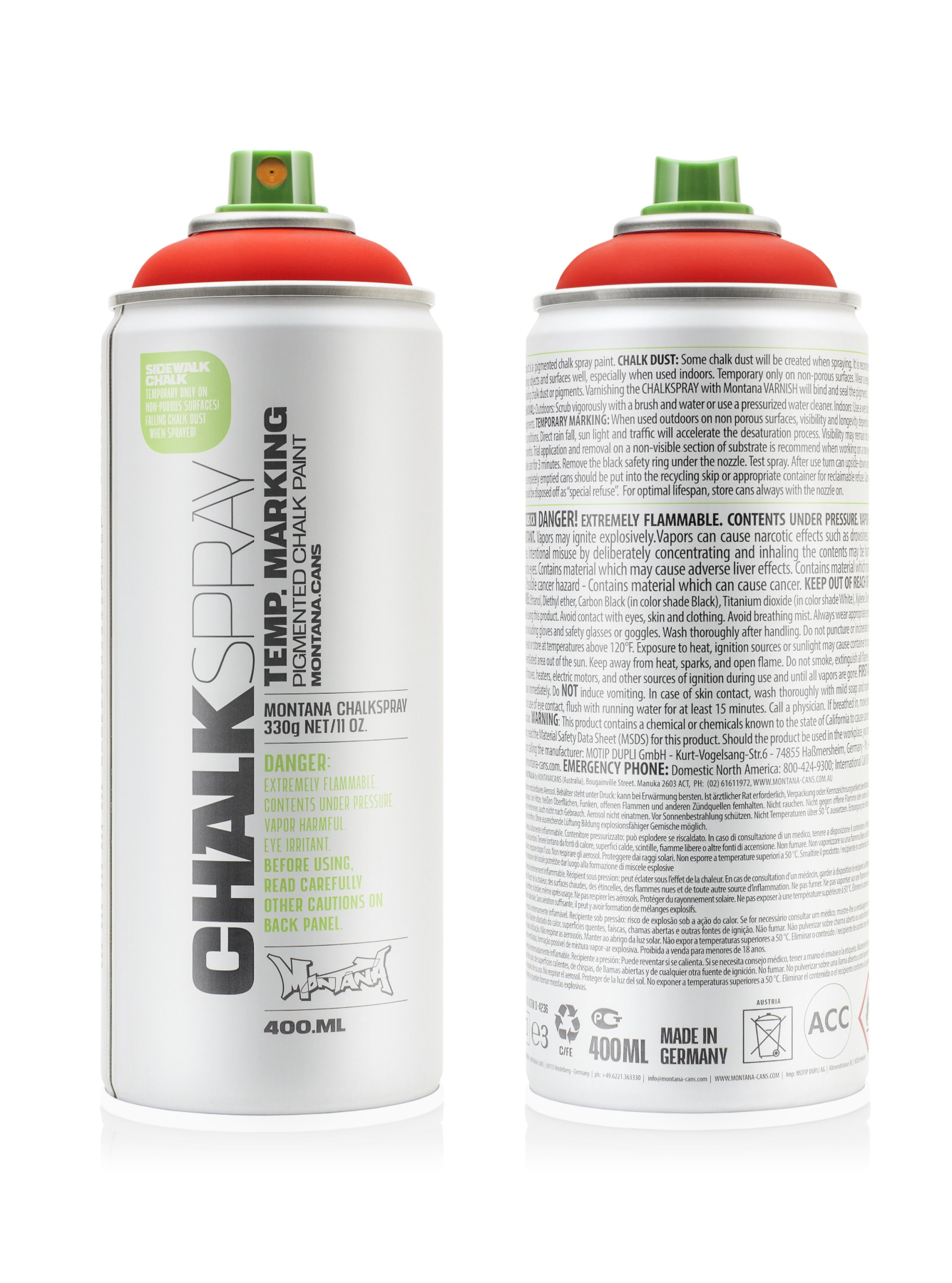 CHALKSPRAY — це пігментована крейдяна фарба, яка ідеально підходить для маркування на відкритому повітрі (лише тимчасово на непористих поверхнях). Доступний у 10 потужних кольорових відтінках, які є глибокими матовими та мають високу покривність. Montana CHALKSPRAY можна наносити на різні поверхні. Залежно від погодних умов і клімату вуличне маркування триває від кількох тижнів до кількох місяців. Малюнок зникає швидше під час тривалих періодів дощу або в місцях з інтенсивним рухом людей. На непористих поверхнях, таких як скло або метал, можна видалити пігменти. Видалення з пористих поверхонь може бути складним. При роботі на непористій поверхні рекомендується пробне нанесення та видалення на невидимій ділянці основи. Montana CHALKSPRAY вражає своїм дотиком і виглядом - типовий грубий ефект крейди.