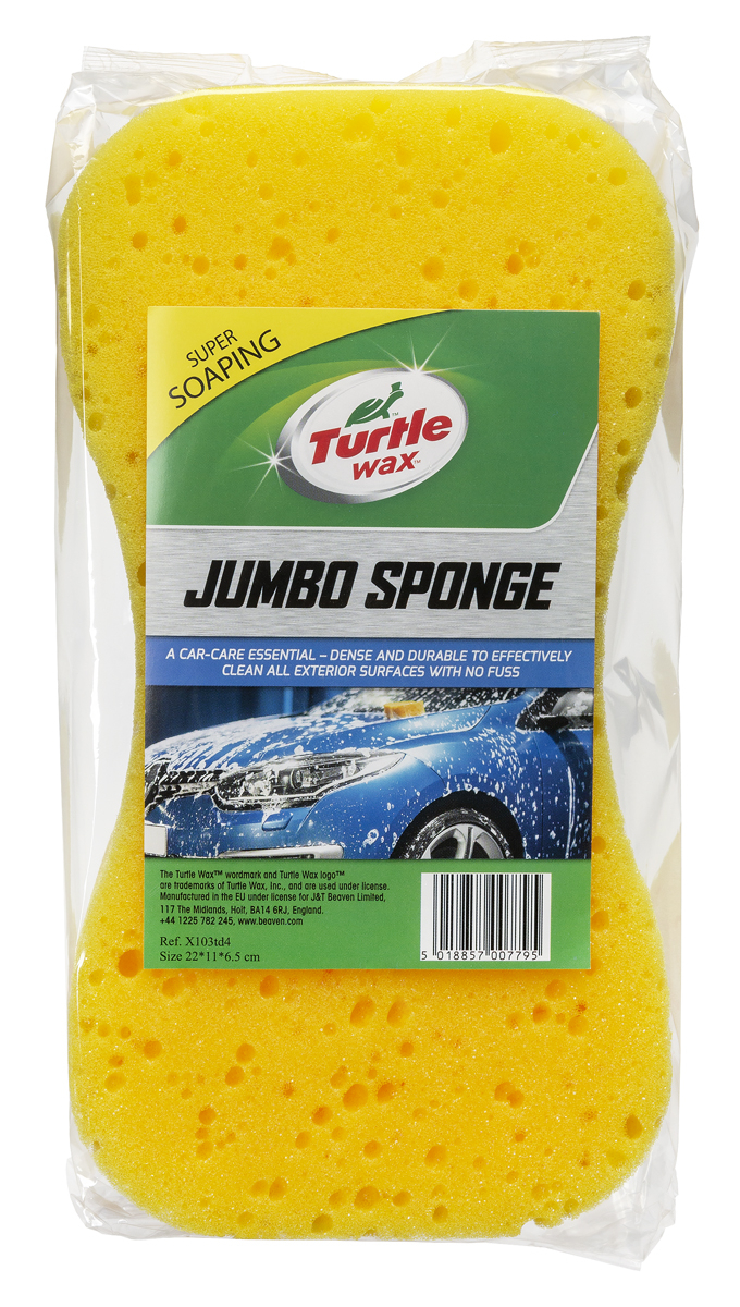 Велика губка для миття Turtle Wax «Джамбо» розроблена спеціально для ручного миття автомобілів, причепів і мототехніки. Губка має велико-пористу структуру, яка ефективно вбирає в себе абразивні частинки піску та бруду, перешкоджаючи їхньому контакту з лакофарбовим покриттям автомобіля і захищаючи його від подряпин і потертостей під час мийки. Окрім того, великі пори губки Turtle Wax сприяють високому піноутворенню і рівномірному нанесенню піни, підвищуючи мийні властивості автомобільного шампуню. Ергономічна форма губки підвищує зручність під час миття. Виконана з міцного матеріалу, стійкого до фізичного впливу й сумісного з усіма видами автошампунів, завдяки чому має дуже тривалий термін служби.