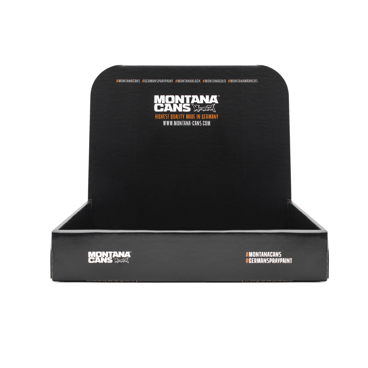 Картонний дисплей Montana — чудове рішення для демонстрації банок 12 x 400 мл зі смаком і практично. Виготовлений із цупкого картону, дисплей має ширину 28,5 см і глибину 22 см. Дизайн доповнюється білим логотипом Montana Typo-Logo на передній правій частині передньої панелі. Ідеально підходить для комерційного використання як вітрина на прилавку магазину або на полиці для висвітлення нових продуктів або для спеціальних кампаній, картонний дисплей також може служити ідеальним елементом будинку для демонстрації на столі вашої улюбленої лімітованої серії банок Montana або для зберігання ваших звичайних використовуйте банки під рукою в студії. Картонний дисплей Montana постачається порожнім.