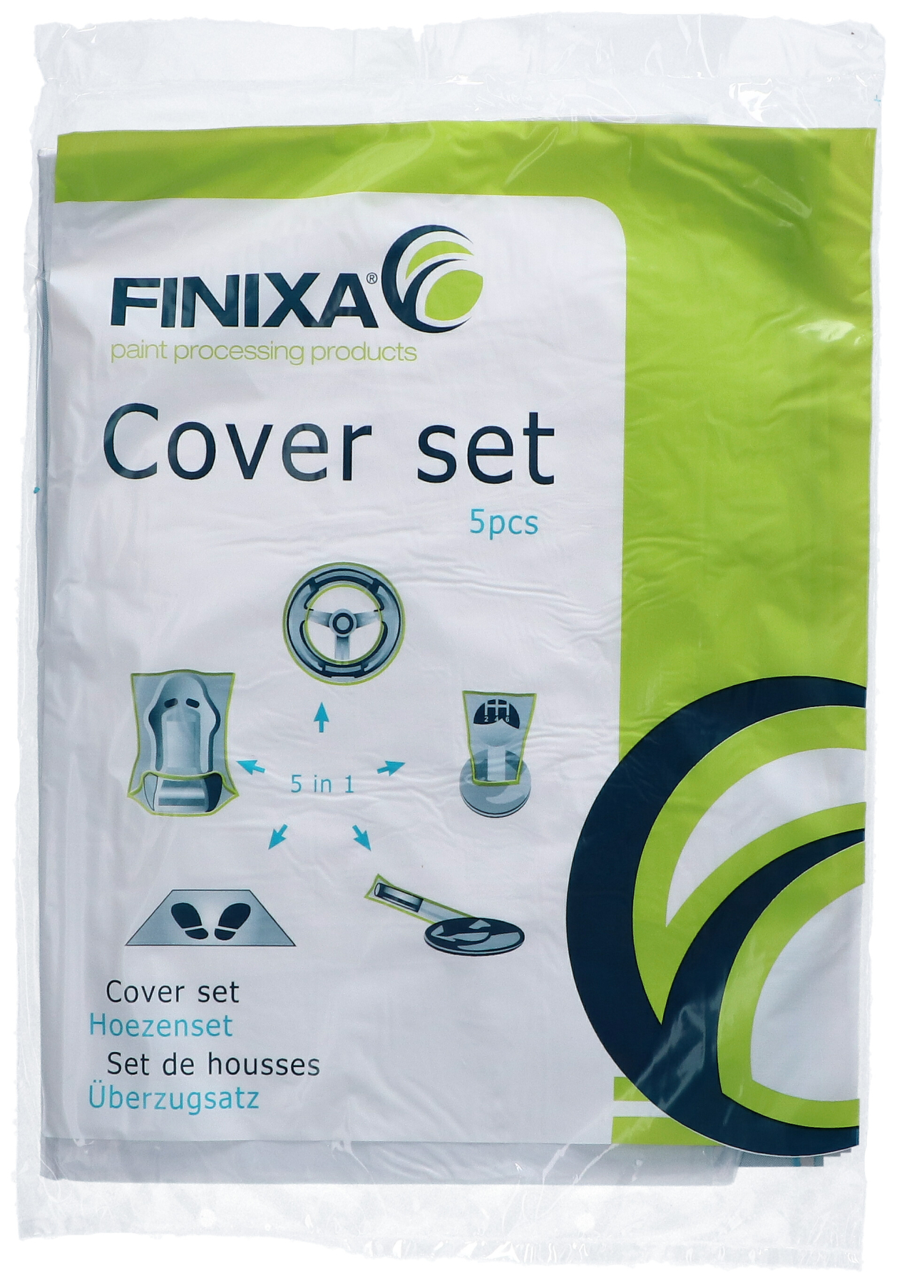 Комплект чохлів для салону автомобіля для захисту від бруду при ремонті автомобіля. Включає: один чохол для сидіння, один килимок для ніг, один чохол для керма, один чохол для важеля перемикання передач і один чохол для рукоятки. Простий у використанні, оскільки для кожної роботи є 1 комплект. Міцна поліетиленова плівка білого кольору.