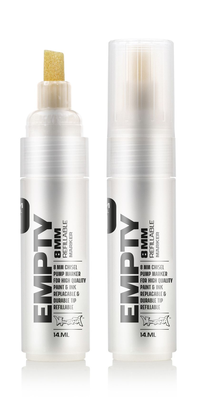Montana EMPTY Marker Chisel 8mm є коротшим гібридом більшого асортименту маркерів EMPTY. Крім того, оснащений спеціально оптимізованою системою клапанів для найкращого контролю потоку, порожній корпус 8-мм CHISEL для багаторазового заправлення вміщує 14 мл рідини та трохи коротший для зручного використання та швидкого зберігання. Підходить для всіх чорнил і фарб Montana, маркер постачається порожнім разом із кульками для змішування. Змінний гострий наконечник долота діаметром 8 мм ідеально підходить для доставки чорнила з барвником і чорнила Montana BOLD Ultra Ink 200 мл. Маркери Montana EMPTY також доступні у вигляді круглих 8 мм/2 мм, зубила 10 мм/3 мм, стандартних 15 мм і дробарки 10 мм.
