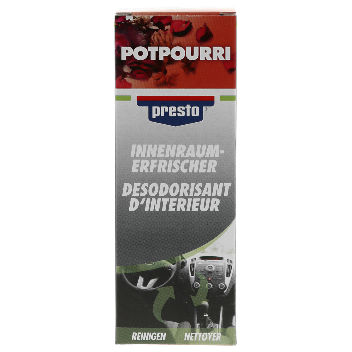 Ефективний засіб очищає систему кондиціонування, усуває неприємні запахи, бактерії та грибок. Очищувач системи кондиціонування Presto не викликає алергічні реакції. Одного балона вистачає для повного очищення системи. Як користуватися: Струшуйте балон протягом 2 хвилин Заведіть двигун та увімкніть систему кондиціонування в режимі рециркуляції на повну потужність, температуру встановіть на мінімум Відкрийте вентиляційні канали Перемістіть переднє сидіння і спинку крісла вперед Вертикально встановіть очисник за кріслом на підлогу, закрийте двері та вікна, натисніть на насадку до клацання і вийдіть з машини Заглушіть двигун через кілька хвилин після повного випаровування Відкрийте всі двері та вікна на 5-10 хв, щоб провітрити машину Термін придатності: 10 років при зберіганні балона при температурі від +10 °C до +25 °C. Вироблено в Нідерландах.