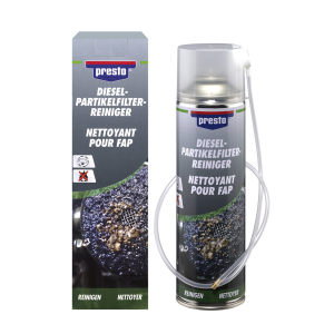 Видаляє золу та відкладення вуглецю в дизельному фільтрі сажі без розбирання самого фільтра. Аерозольний очищувач фільтр сажі «DPF cleaner» Presto не містить розчинників і не загоряється. Після висихання не залишає слідів та осаду. Одного балона вистачає для одного повного очищення фільтра. Відповідає нормам TRG 300.