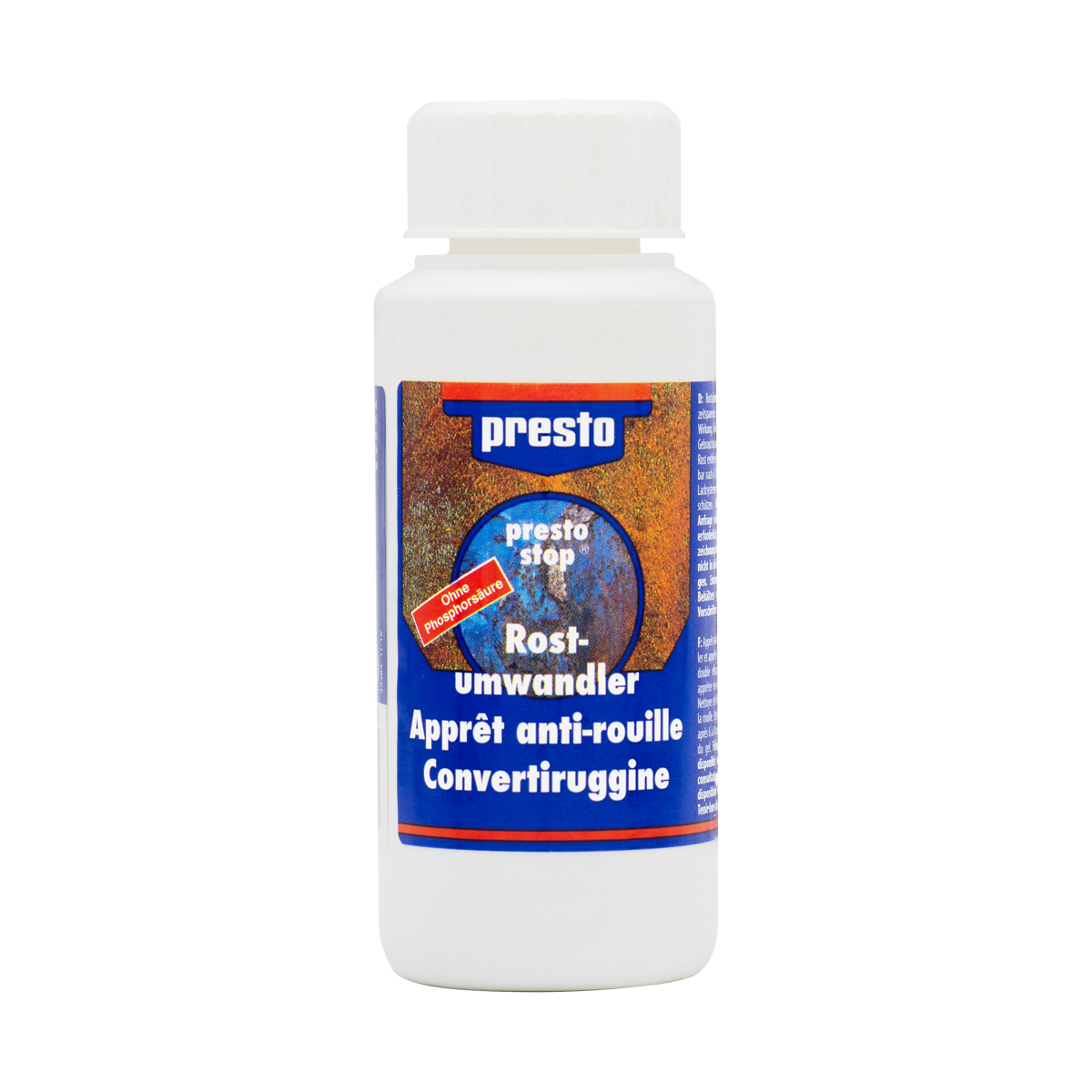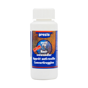 Швидко розчиняє і перетворює в ґрунт чорного кольору навіть стару і щільну іржу та не дає утворюватися корозії. Ґрунт добре відштовхує воду і покращує адгезію фарб або лаків. Перетворювач іржі Presto підходить для обслуговування авто, мотоцикла, велосипеда і домашнього використання.