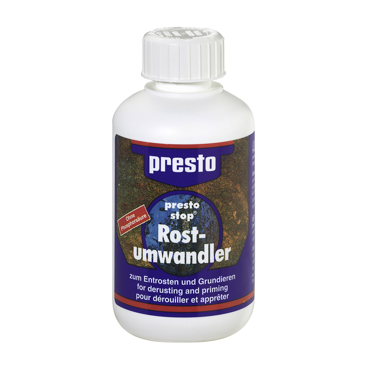 Швидко розчиняє і перетворює в ґрунт чорного кольору навіть стару і щільну іржу та не дає утворюватися корозії. Ґрунт добре відштовхує воду і покращує адгезію фарб або лаків. Перетворювач іржі Presto підходить для обслуговування авто, мотоцикла, велосипеда і домашнього використання.