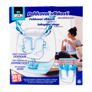 Поглинач вологи з наповнювачем Bison Ambiance знижує рівень конденсату, вологи та застарілих запахів у житлових та нежитлових приміщеннях в будинку та навколо ньогу, таких як: сарай, підвал, комора, гараж, а також у трейлерах, причепах, човнах. Захищає ваші цінності від вологи та знижує надмірну відносну вологість у всіх закритих приміщеннях з недостатньою вентиляцією або взагалі без неї. Відмінно бореться та запобігае появі плям від утворення конденсату, затхлого запаху, цвілі, плям від вологи, шкідників і гниття деревини. Завдяки стильному дизайну поглинач вологи Ambiance ідеально підходить для використання у вітальнях, спальнях, дитячих кімнатах, ванних кімнатах, туалетах тощо. Вологопоглинач не споживає електроенергі, не шумить та освіжає повітря. Підходить для різних видів наповнювачів: таблеток різної форми та гранул. В комплект входить наповнюч (таблетка) у формі магниту. Для заміни наповнювача, після використання, виробник пропонує наповнювач у вигляді мішечка з ароматизованими гранулами та гранулами без запаху.