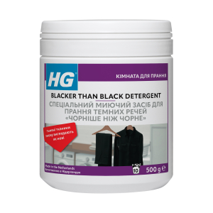 Спеціальний засіб для прання темних речей "чорніше чорного" HG робить темні тканини, що потьмяніли, знову наче абсолютно нові. Завдяки використанню цього спеціального засобу чорні речі дійсно залишаються чорними або відновлюють свій чорний колір. Засіб також запобігає вицвітанню, злипанню волокон і утворенню катишків на тканині. Якщо чорний або інший темний текстиль не піддавати окремому пранню, він потьмяніє під час носіння, прання та сушіння в сушильній машині. Підходить також для інших темних тканин. Вистачає на 10 прань.
