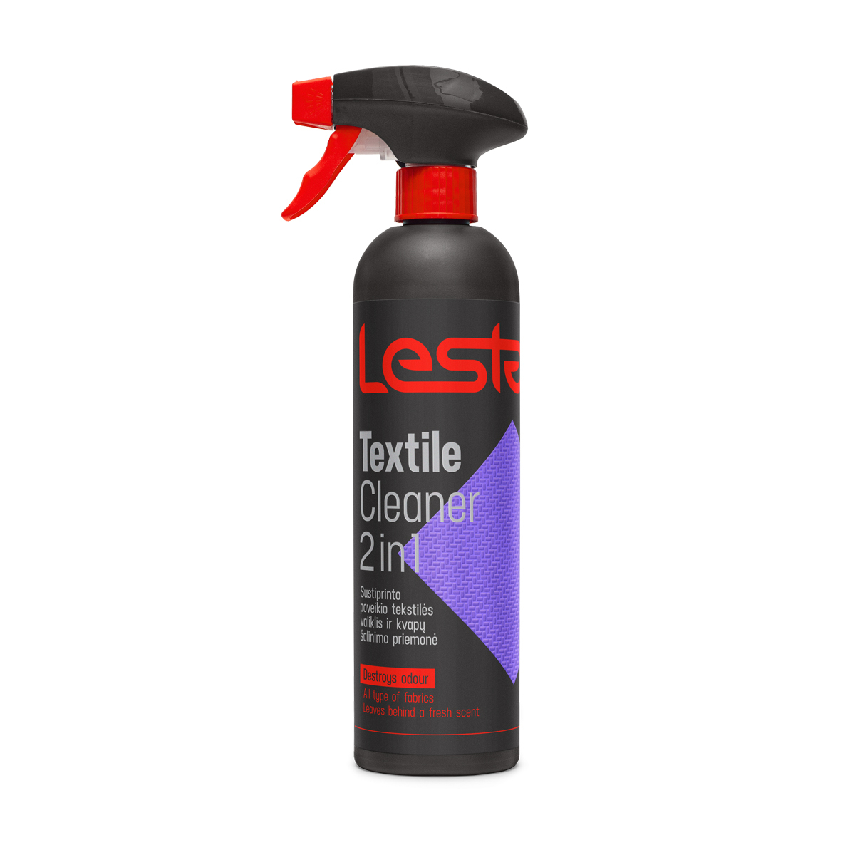 Засіб для очищення текстилю та видалення запахів посиленої дії Lesta Textile Cleaner 2in1 500 мл з технологією ""Air refresher"" усуває неприємні запахи, що в'їлися і залишає легкий свіжий аромат. Підходить для всіх типів оббивки і килимових покриттів автомобілів. Повертає первісний колір матеріалам. Не залишає плям.